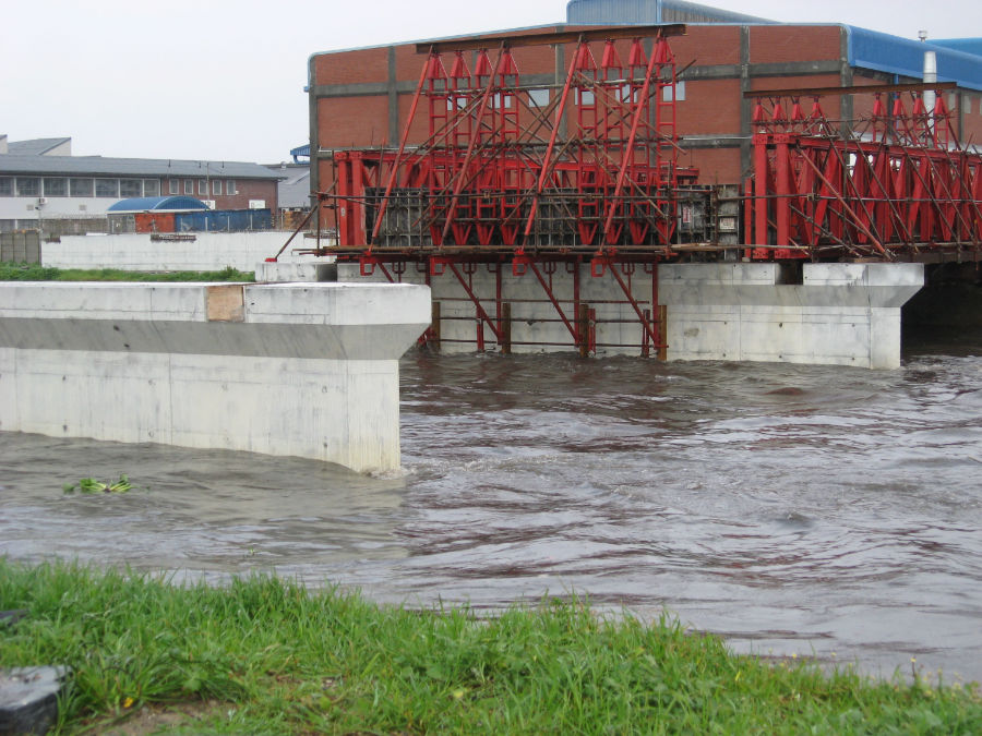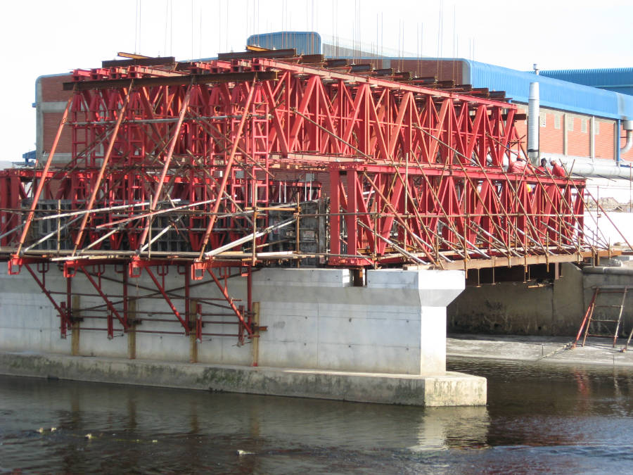 The bridge piers were constructed by installing temporary caissons to allow excavation, dewatering and the construction of the bridge piers, with the bridge beams and deck cast in situ.